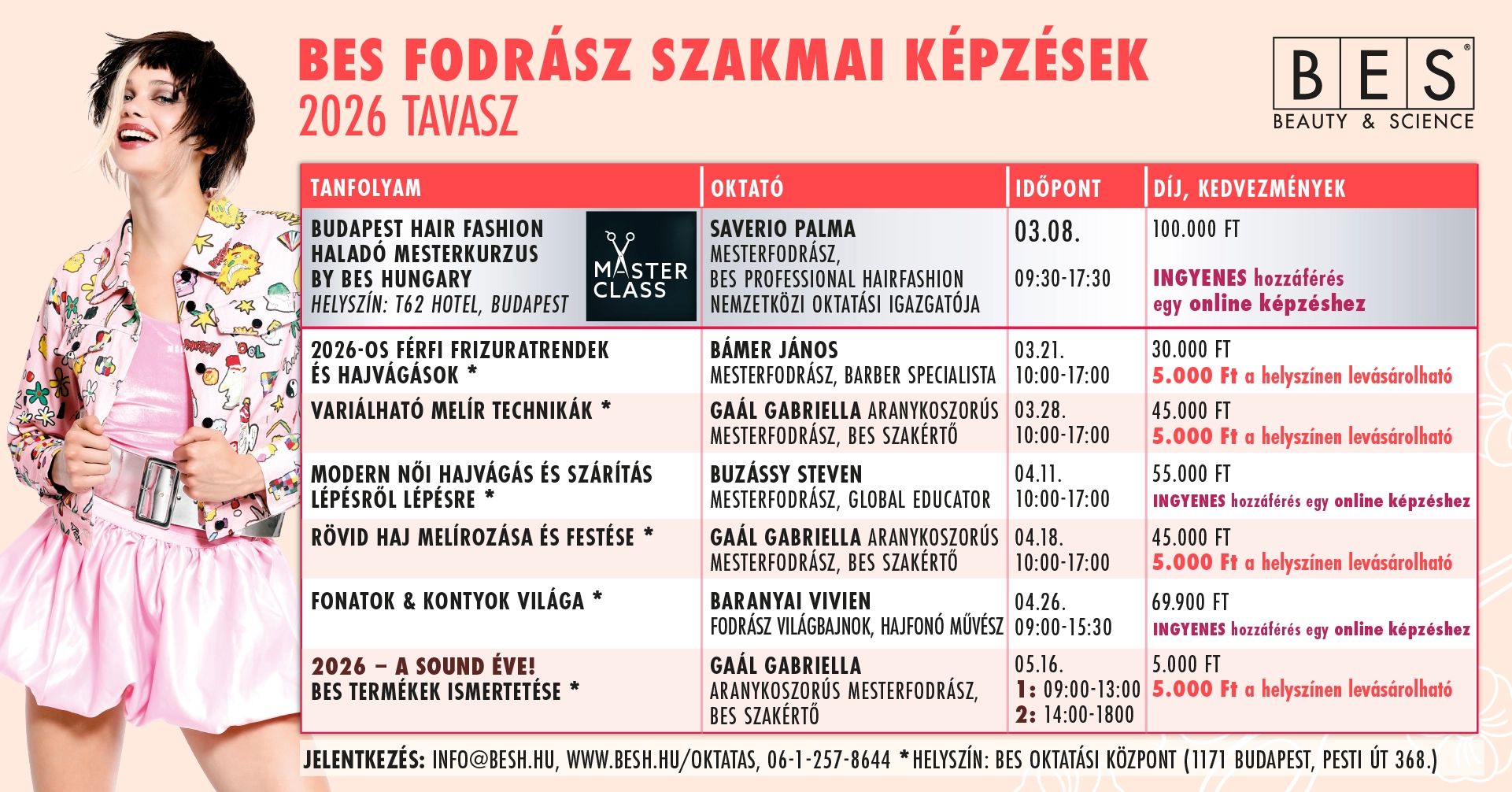 Oktató fodrászunkkal előre egyeztetitek a témákat (pl.: szőkítés, festés, termékismeret, hajkiegyenesítés, vágás, stb.) amelyekről elméleti és gyakorlati oktatást is tart. A választott témához kapcsolódó BES termékeket oktató fodrászunk hozza!